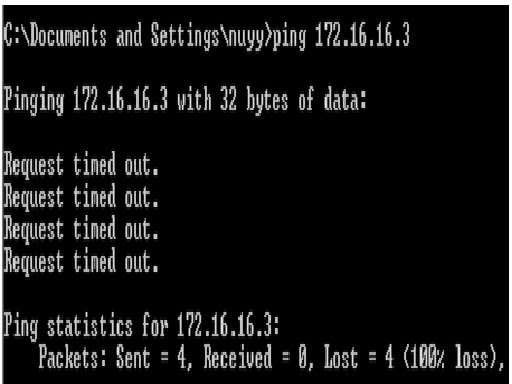 b. Pengecekan konfigurasi dari PC3 ke PC1 , (dalam area VLAN yang berbeda) dan akan muncul tampilan seperti gambar dibawah ini: